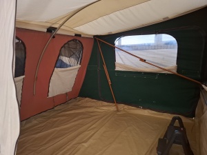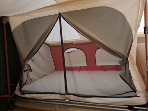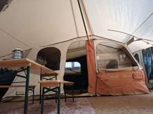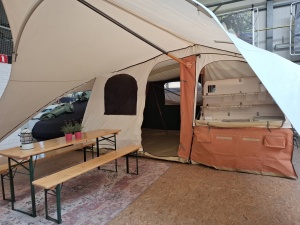 De Kyte XL is weinig gebruikt en dat is te zien. Het tentdoek voelt nog stevig en heeft weinig verkleuring. In juni 2024 werd de Holtkamper het laatst voorzien van een onderhoudsbeurt bij Holtkamper. Hierbij werden onder andere de banden vervangen.